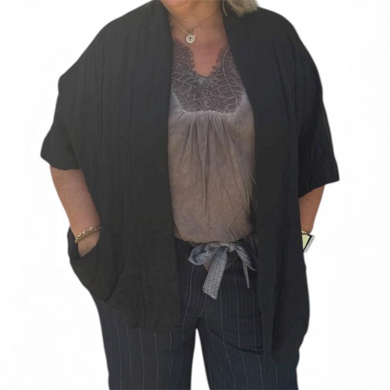 Apportez une touche d’élégance artisanale à votre garde-robe avec cette veste noire ornée de broderies blanches délicates.