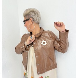 Sa coupe droite et courte est modernisée par un patch fleur blanche sur la poitrine et des boutons pression blanches.