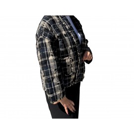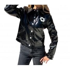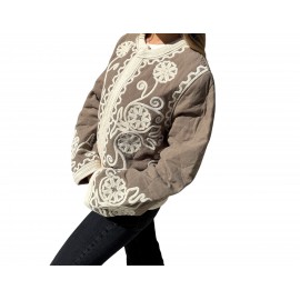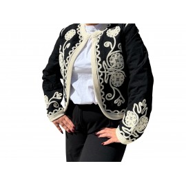 Apportez une touche d’élégance artisanale à votre garde-robe avec cette veste noire ornée de broderies blanches délicates.